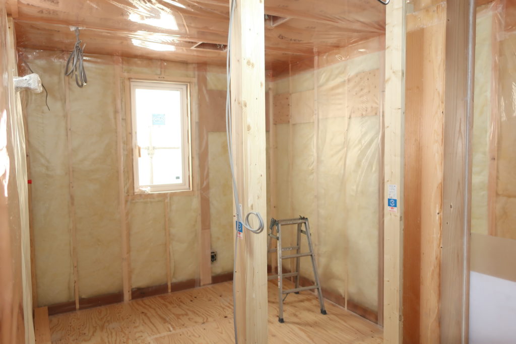 壁・グラスウール105ミリ、天井・グラスウール200ミリ、床・A種押出法ポリスチレンフォーム65ミリ、防湿気密シート、気密テープ等で気密施工。